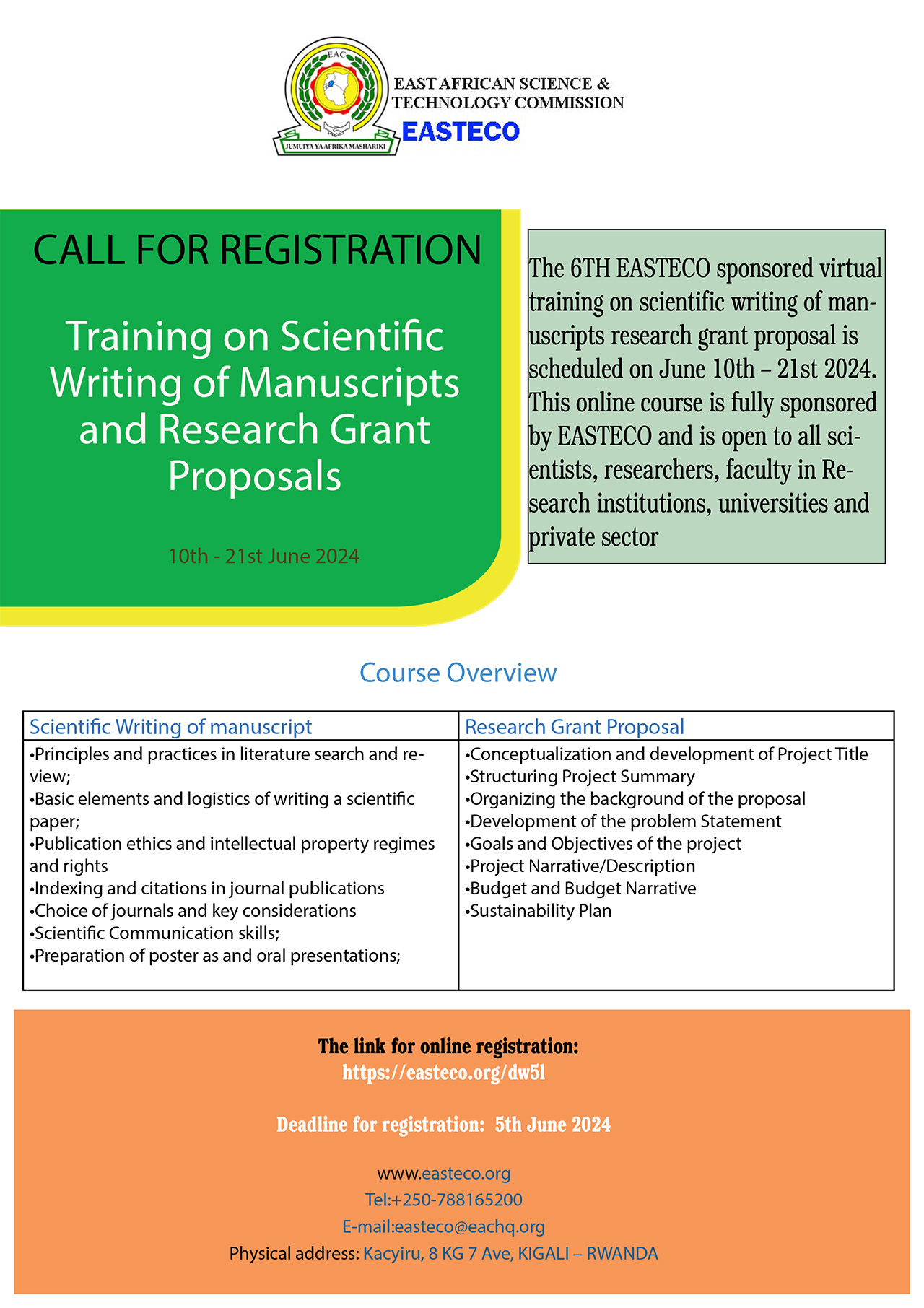 The 6TH EASTECO sponsored virtual training on scientific writing of manuscripts research grant proposal is scheduled on June 10th – 21st 2024. This online course is fully sponsored by EASTECO and is open to all scientists, researchers, faculty in Research institutions, universities and private sector